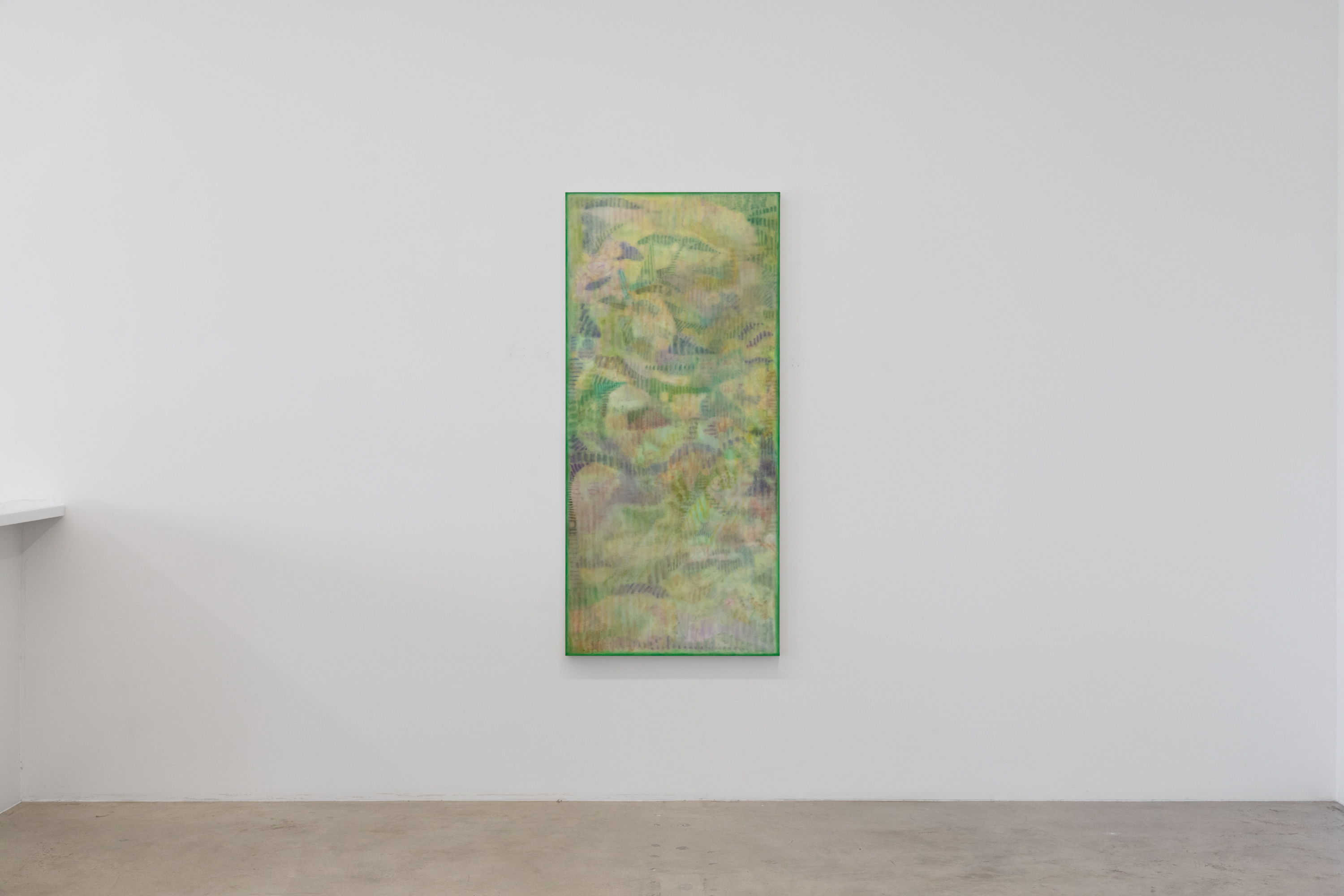 One work with an orange-tinged border presents almost like a vertical landscape, abundant with lush-like forms, fruitful masses, and striated patterns of sage, burgundy, and rust. Peering into its laminations, the deposits of color nearly appear to reveal an image, but of what is uncertain.