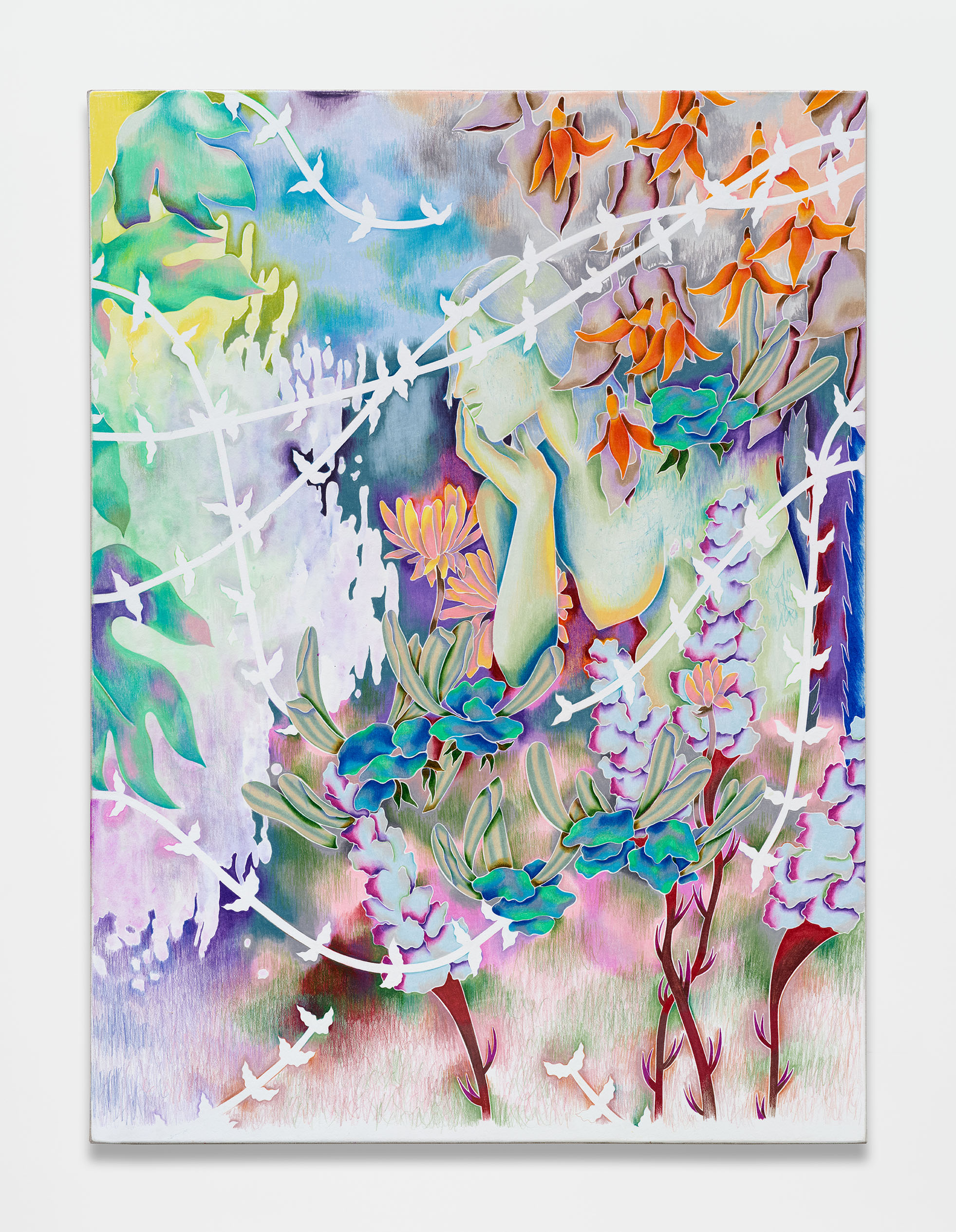 The images in Weber’s eighteen panels rhyme with Ovid’s descriptions of those made by both Arachne and Minerva. Peonies, daffodils, tulips, amaryllis, sunflowers, driftwood, wasps nests, and cypress trees adorn the surfaces and are interwoven with entangled ivy. A figure, hidden amongst the foliage, lifts a palm to the skies while another holds her head softly in her hands. Towards the bottom of each panel, Weber’s colored pencil marks become more faint and loose, mimicking the appearance of strands of thread being undone. These lighter marks offer glimpses of the white beyond. However, rather than a blankness, another reading of Weber’s use of white is one of ultimate saturation, in which all colors combine at once into a blinding force: a visually literalized “white noise” reflecting the impenetrable mystery of the universe and the mercurial motivations of the gods.