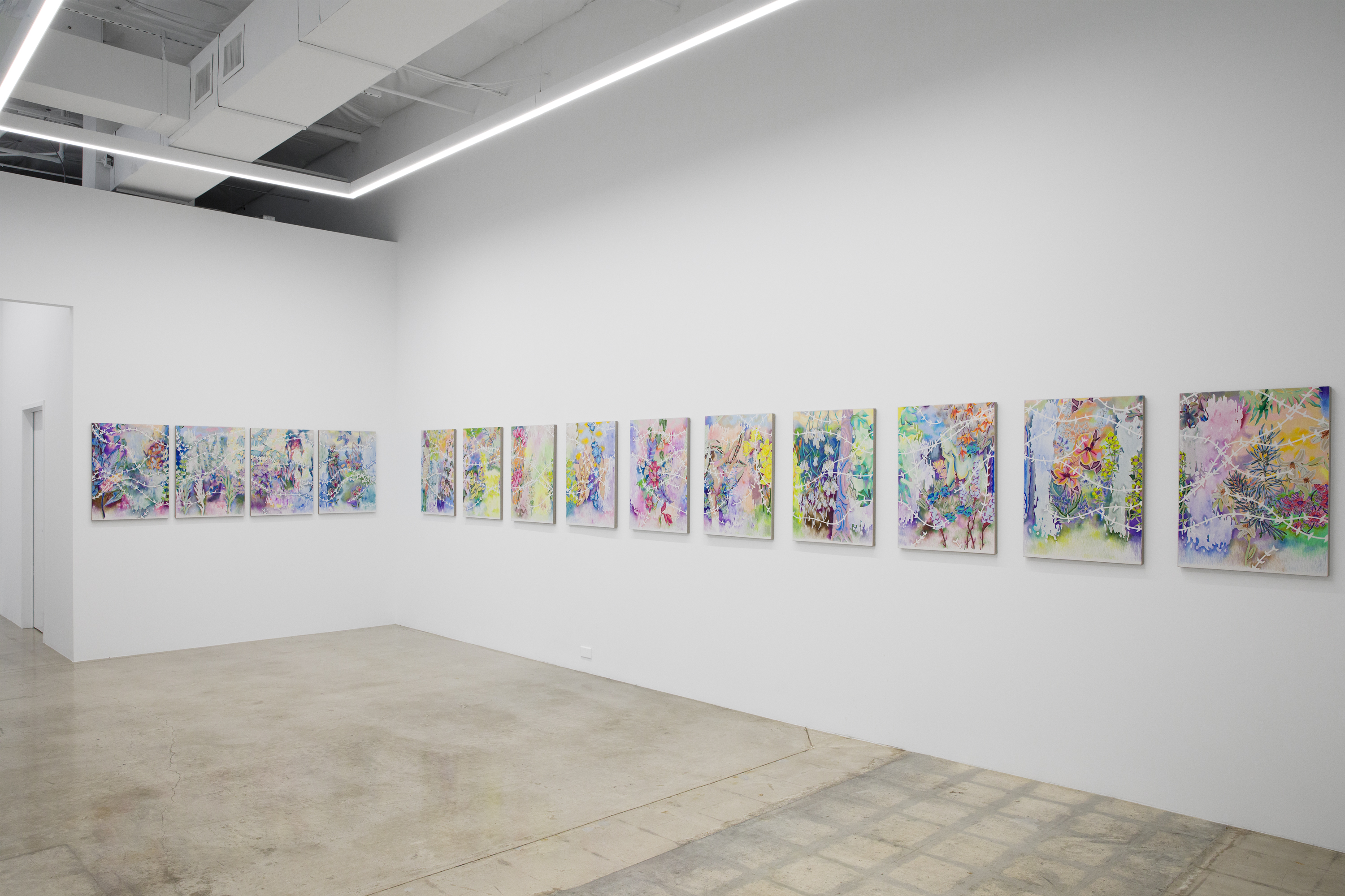 Across eighteen panels, Weber uses her trademark colored pencils and watercolor to compose a panorama of another world: primeval, overgrown and lush with chromatic saturation. While individually unique in composition, each panel simultaneously bleeds into the next, its borders amorphous as the ever-shifting landscape gives way to new vistas and worlds within worlds. In addition to faint visages of the feminine human form, Weber introduces another spectral element in the enrapturing presence of ghostly-white vines that weave throughout the panels, further linking them through time and space. In this continuity the work presents a meditation on time, gestation, and connectivity, as well as an approach to art making that is indicative of her practice writ large.