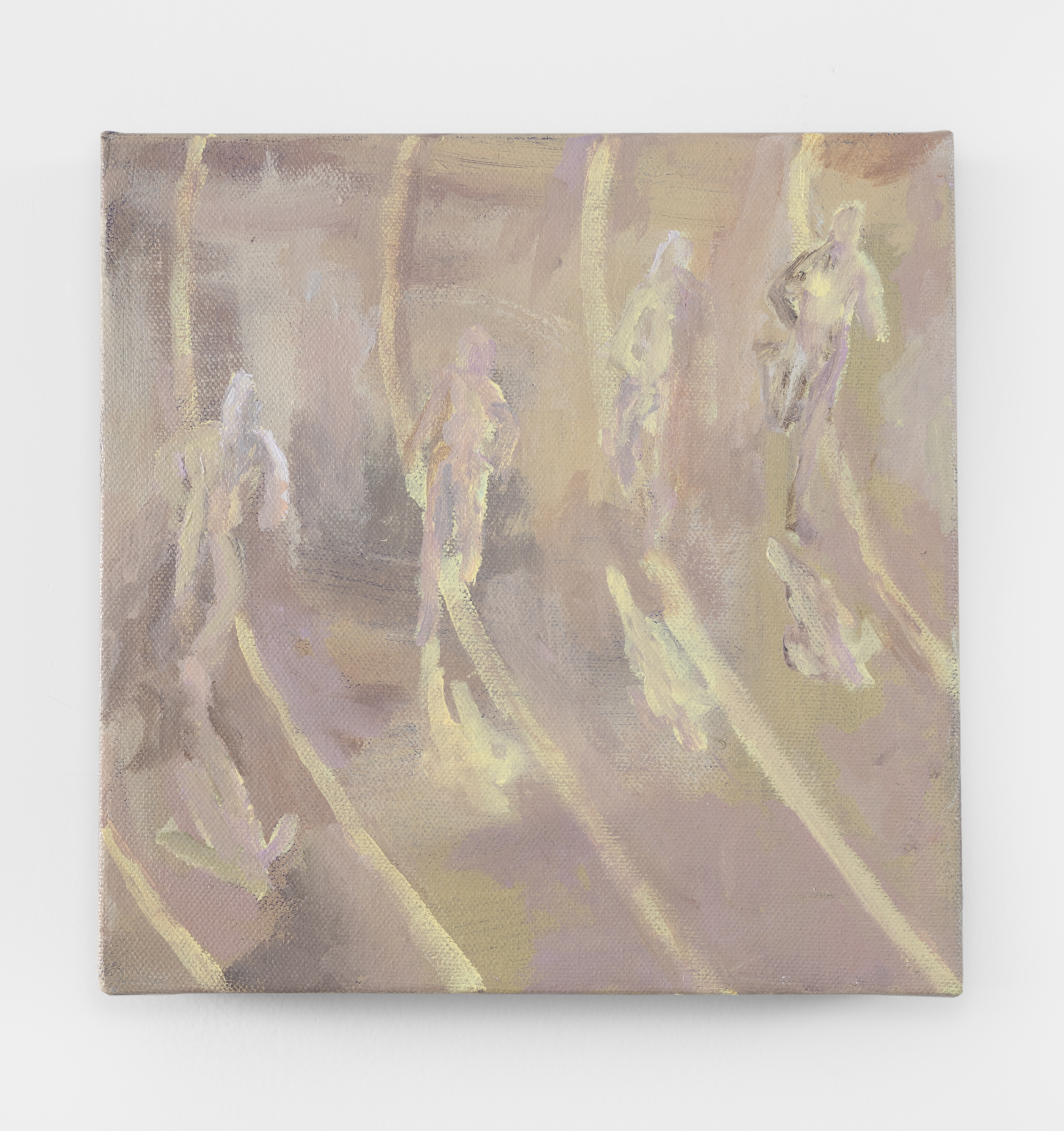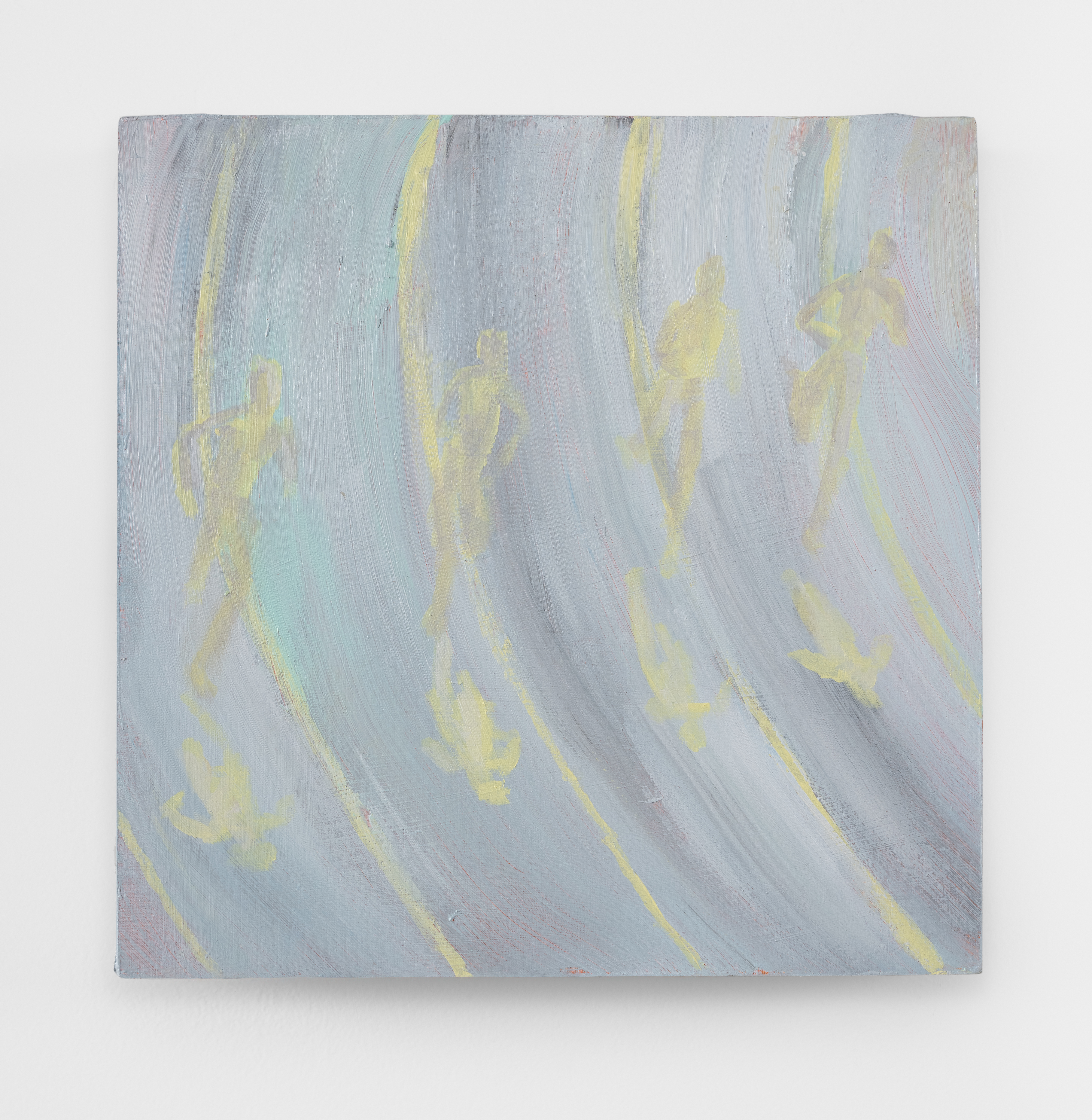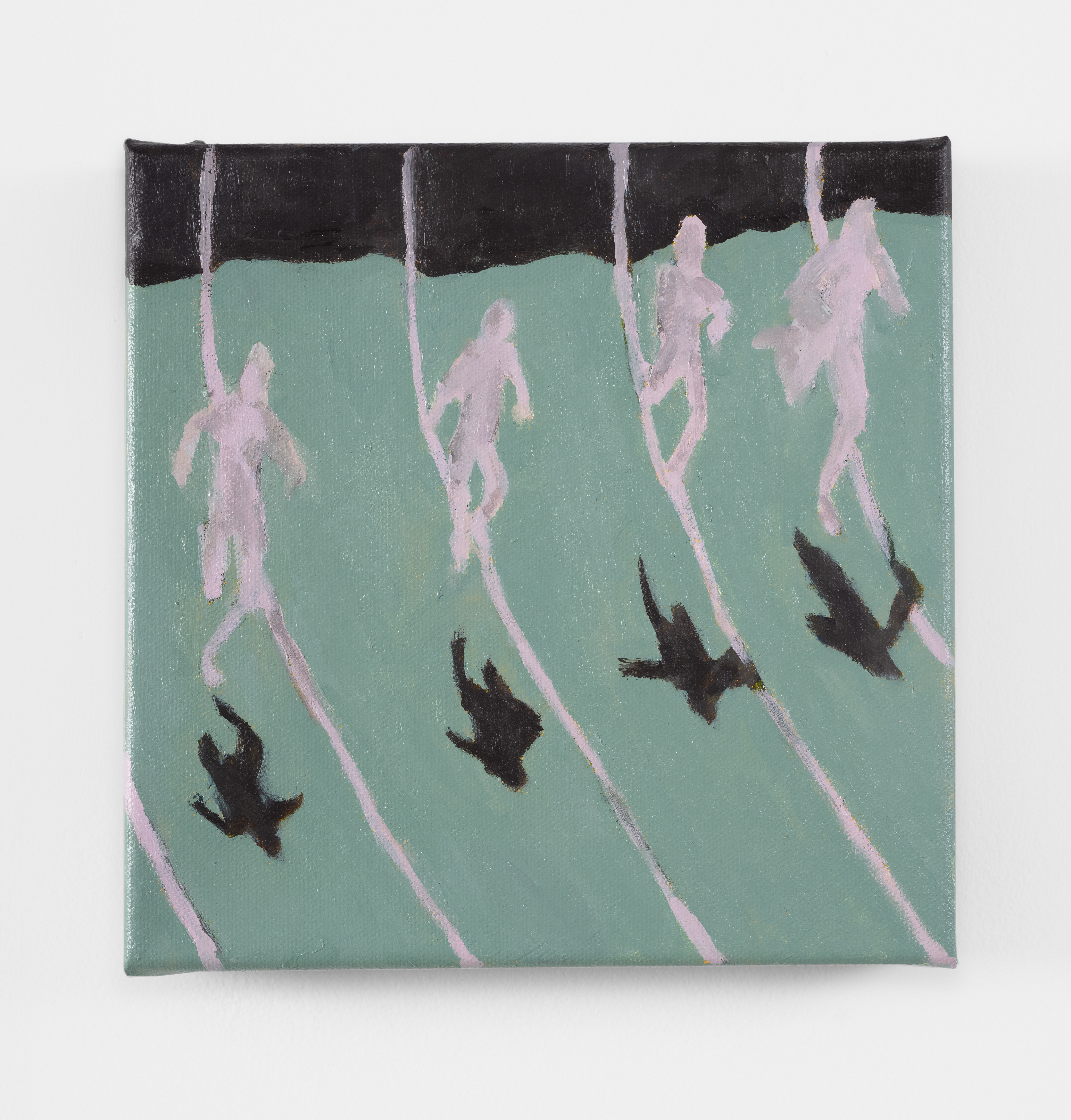 Each work features the same image: four runners aligned in a congruent formation, their murky, muted shadows lying just beneath their forms. There is a harmony in their consistency, yet a discord between the tones, contrast, and brushwork.